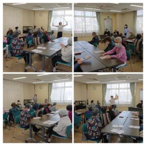 初めに佐久間様より認知症についてのお話しを、続いて体操を行いました。認知症は早めの検診が大事ですので近くの病院の紹介などをしていただました。